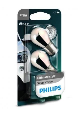 When turned off, Philips SilverVision bulbs prevent from unaesthetic orange effect in optics thanks to its unique Chrome coating. When turned on, it emits an orange, homologated light.